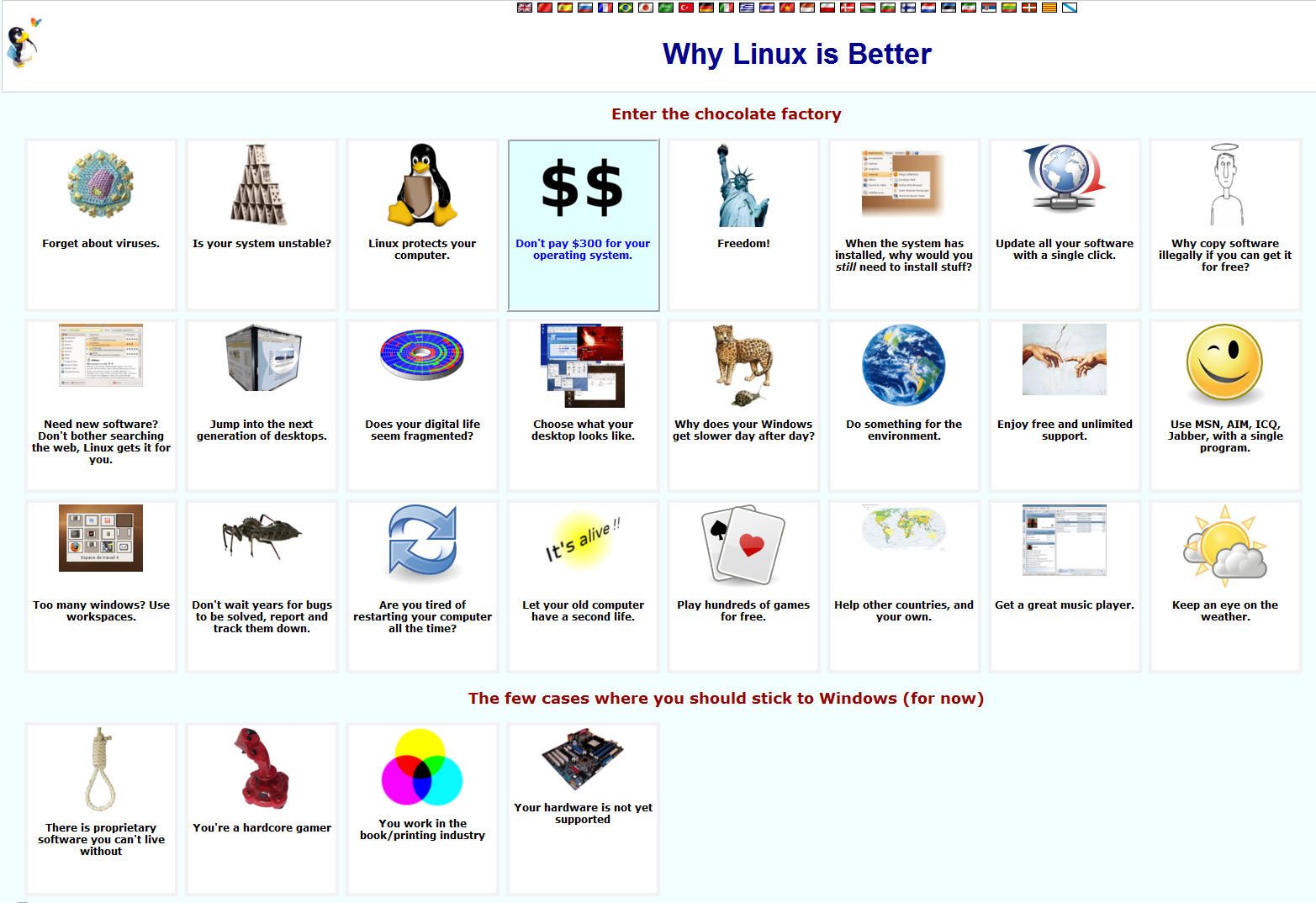 Lo mismo ocurre con este sitio web, llamado «Why Linux is better» (Por qué Linux es mejor) en el que se exponen las razones más importantes por las cuales cualquier usuario debería abandonar inmediatamente su sistema Windows y pasarse a alguna distribución de GNU/Linux.
