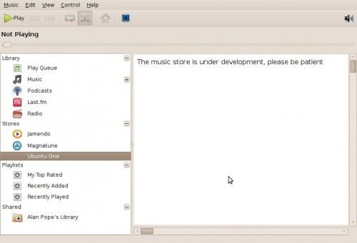 No es esforcéis en buscar acceso al servicio desde Ubuntu 10.04 Alpha 3. Rythmbox ya muestra esa opción, pero solo está accesible a beta testers con cuentas de Ubuntu One validadas.