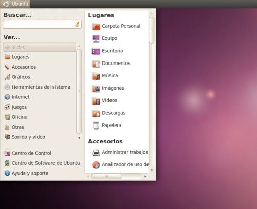 El menú esta dividido en dos partes, en el lado derecho se pueden ver todos los lugares y todas las aplicaciones en una larga lista que puedes recorrer de arriba a abajo, mientras que a la izquierda puedes buscar o filtrar por categorías los elementos del lado derecho. También hay acceso directo al Centro de Control, Centro de Software y Ayuda del Sistema. El menú es bastante simple y directo, de hecho puedes acceder a todo con la misma cantidad de clicks que con la barra de menús, por lo que la usabilidad no se ve afectada, en realidad mejora gracias a su buscador integrado.