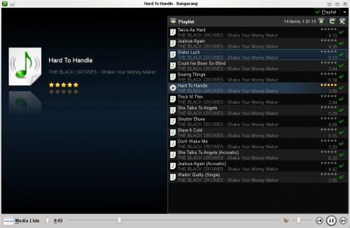 En tercer lugar, Bangarang se aleja del camino marcado por los anteriores ya que es un reproductor multimedia en toda regla, dando la misma importancia tanto a la música como a los vídeos. Picajoso ya nos lo presentó, pero desde entonces ha llovido mucho y Bangarang dispone hace tiempo de una versión estable (la 1.0.1), además de seguir su desarrollo de cara a la siguiente (aunque en estos momentos desconozco las novedades que traerá consigo, la 2.0 se encuentra en estado alfa).