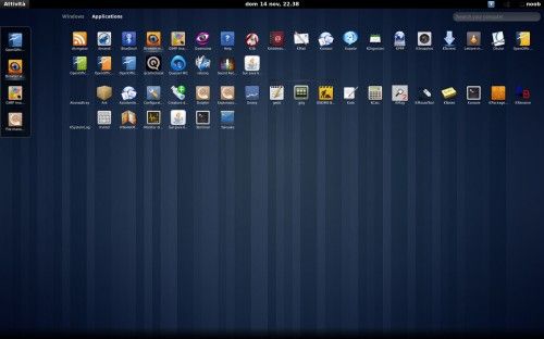Lo demuestra el artículo de OMG! Ubuntu! en el que nos muestran una serie de capturas de un miembro de una comunidad italiana de usuarios de Ubuntu con el aspecto actual de GNOME Shell en su compilación más reciente. De hecho, la interfaz recuerda bastante a Unity, ya que el menú de actividades presenta todos los iconos de aplicaciones en un gigantesco mosaico que presenta la s aplicaciones abiertas y los items destacados.