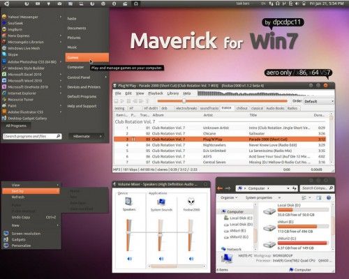 Es el caso de este tema para Windows 7 llamado «Maverick for Win7«, que está diseñado para imitar el aspecto del tema Ambiance que se eligió por defecto para Ubuntu 10.10 Maverick Meerkat.