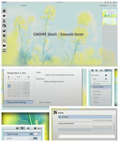 En WebUpd8 nos enteramos del que podría ser el primer tema «real» para GNOME Shell, llamado Smooth Inset y hecho por half-left de deviantART, podemos apreciar el fantástico resultado en la imagen que acompaña esta entrada. Esto no tiene nada que ver con los presentados la otra vez, ya que GNOME Shell ha cambiado «un poquito» desde entonces y es probable que dichos temas finalmente se queden algo desfasados.