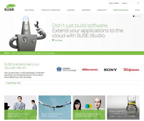 El nuevo diseño es claro y elegante, y en él encontraremos algunos de los servicios promocionados de la empresa -con SUSE Studio a la cabeza- y todos sus productos, servicios y planes de soporte -que, afirman, son un 50% más económicos que los de Red Hat- en ese nuevo diseño.