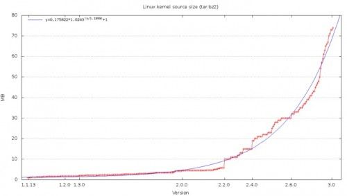 Como explica Jérôme Pinot en la lista LKML y en el post de su blog, el crecimiento es en su mayoría «exponencial», y si se mantiene al mismo ritmo, el kernel Linux ocupará 100 Mbytes en su versión tar.bz2 para cuando lleguemos a Linux 3.19 (el kernel 3.1.1, que apareció el pasado 11 de noviembre, pesa 73,7 Mbytes).