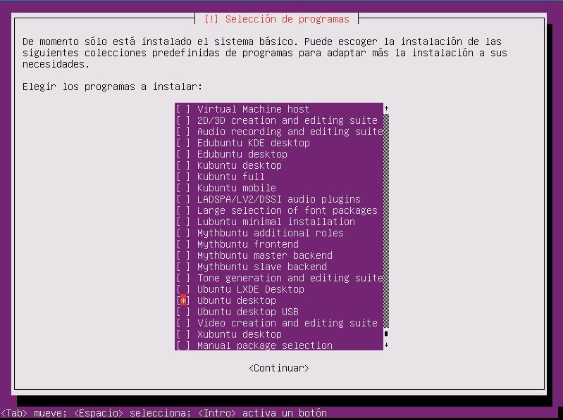 Una vez en este punto el asistente de instalación descargará de la red la última versión del sistema básico y nos lo instalará en nuestro disco duro, este proceso tardará un rato dependiendo de la velocidad de nuestra conexión a Internet, así que podemos ir a tomarnos un refresco o un café si nos apetece. Una vez instalado el sistema básico agregamos nuestro usuario nos preguntará que queremos instalar. Por defecto no instalará nada, así que es importante que seleccionemos qué entorno de escritorio queremos instalar, para ello usaremos la barra espaciadora.