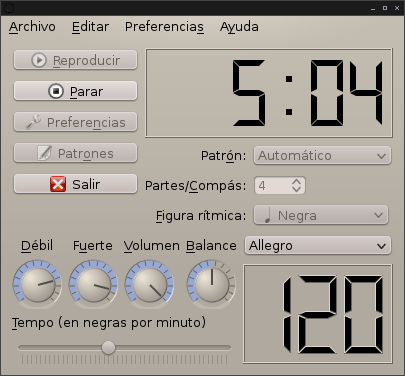 En segundo lugar, hay que mencionar el metrónomo. A diferencia del anterior, no recomiendo ahora adquirir uno electrónico, pues hay buenas herramientas a disposición. En el caso de practicar sobre una pista MIDI existente, lo mejor es importarla a nuestro secuenciador (Tuxguitar o Rosegarden) y activar el metrónomo, sin tener que preocuparnos de la marca de tiempo. Por otro lado, un metrónomo muy sencillo de utilizar es KMetronome, especialmente para tiempos simples.