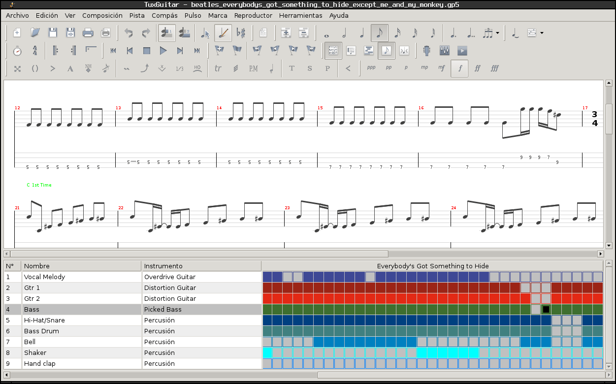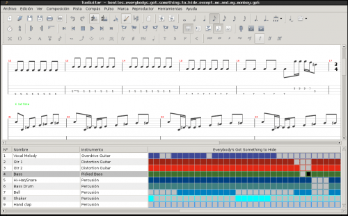 Por otro lado, para quienes estudien (o quieran estudiar) instrumentos de cuerda pulsada, más que nada guitarra o bajo, puede no ser necesario leer partituras sino tablaturas. Un programa ideal es Tuxguitar, que ya lo había mencionado en otro artículo, que emplea este tipo de notación en conjunto con su equivalente en partitura. Además contiene un generador de acordes para conocer un poco más de los nombres que toman y posibles variantes.