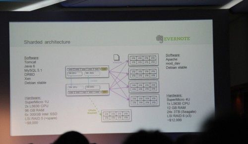 Una de las curiosidades de la arquitectura de Evernote es el hecho de su evolución en rendimiento: mientras que hace año y medio cada servidor albergaba los datos de 100.000 usuarios, ahora esos mismos servidores llegan a los 200.000 usuarios. ¿La razón? El uso de unidades SSD en lugar de discos duros tradicionales, algo que también comentó en su post «Shard Boiled» en abril de 2012.
