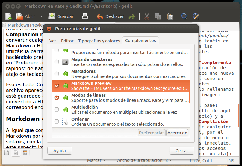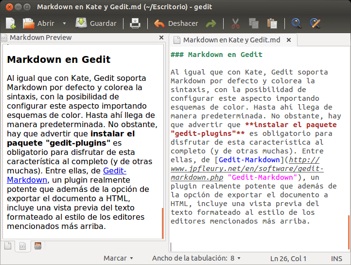 Al igual que con Kate, Gedit soporta Markdown por defecto y colorea la sintaxis, con la posibilidad de configurar este aspecto importando esquemas de color. Hasta ahí llega de manera predeterminada. No obstante, hay que advertir que instalar el paquete «gedit-plugins» es obligatorio para disfrutar de esta característica al completo… y de otras muchas. Entre ellas, de Gedit-Markdown, un plugin realmente potente que además de la opción de exportar el documento a HTML, incluye una vista previa del texto formateado al estilo de los editores mencionados más arriba.