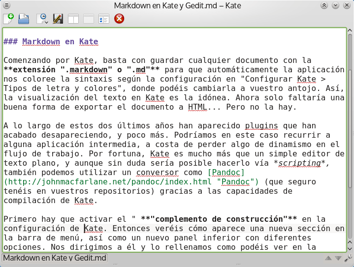 Comenzando por Kate, basta con guardar cualquier documento con la extensión «.markdown» o «.md» para que automáticamente la aplicación nos coloree la sintaxis según la configuración en «Configurar Kate > Tipos de letra y colores», donde podéis cambiarla a vuestro antojo. Así, la visualización del texto en Kate es la idónea. Ahora solo faltaría una buena forma de exportar el documento a HTML… Pero no la hay.