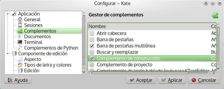 Primero hay que activar el » «complemento de construcción» en la configuración de Kate. Entonces veréis cómo aparece una nueva sección en la barra de menú, así como un nuevo panel inferior con diferentes opciones. Nos dirigimos a él y lo rellenamos como podéis ver en la siguientes imágenes: