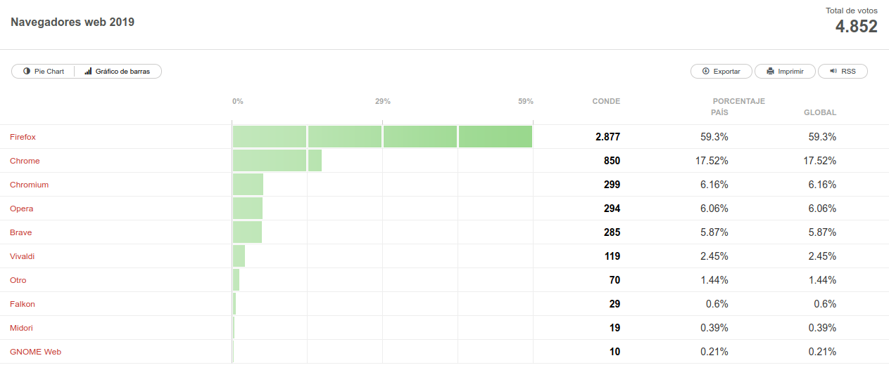 Los restos, como por otra parte es normal, se los llevan los navegadores más pequeños con apenas un puñado de votos cada uno: Falkon (el mejor parado de los tres), Midori y un GNOME Web del que en principio esperaba un poco más de empuje. Es normal, porque en comparación con los demás tienen poco que ofrecer; pero ahí están para quien los quiera y para tareas sencillas cumplen con su cometido.
