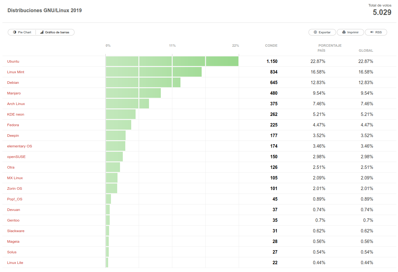 Como también es habitual, Linux Mint le sigue a la zaga a base de no salirse la las buenas formas a las que nos tiene acostumbrados y gracias a lanzamientos como Linux Mint 19.2 y Linux Mint 19.3, consigue aumentar sensiblemente su margen de aceptación. Lo mismo para con Debian, y es que el sistema operativo universal nos dejó en 2019 su nueva versión estable, Debian 10. Sobran más palabras porque la escena la conocemos de sobra: Ubuntu, Linux Mint y Debian se llevan siempre el podio y lo hacen por méritos propios. Las tres en conjunto reciben más del 50% de los votos.